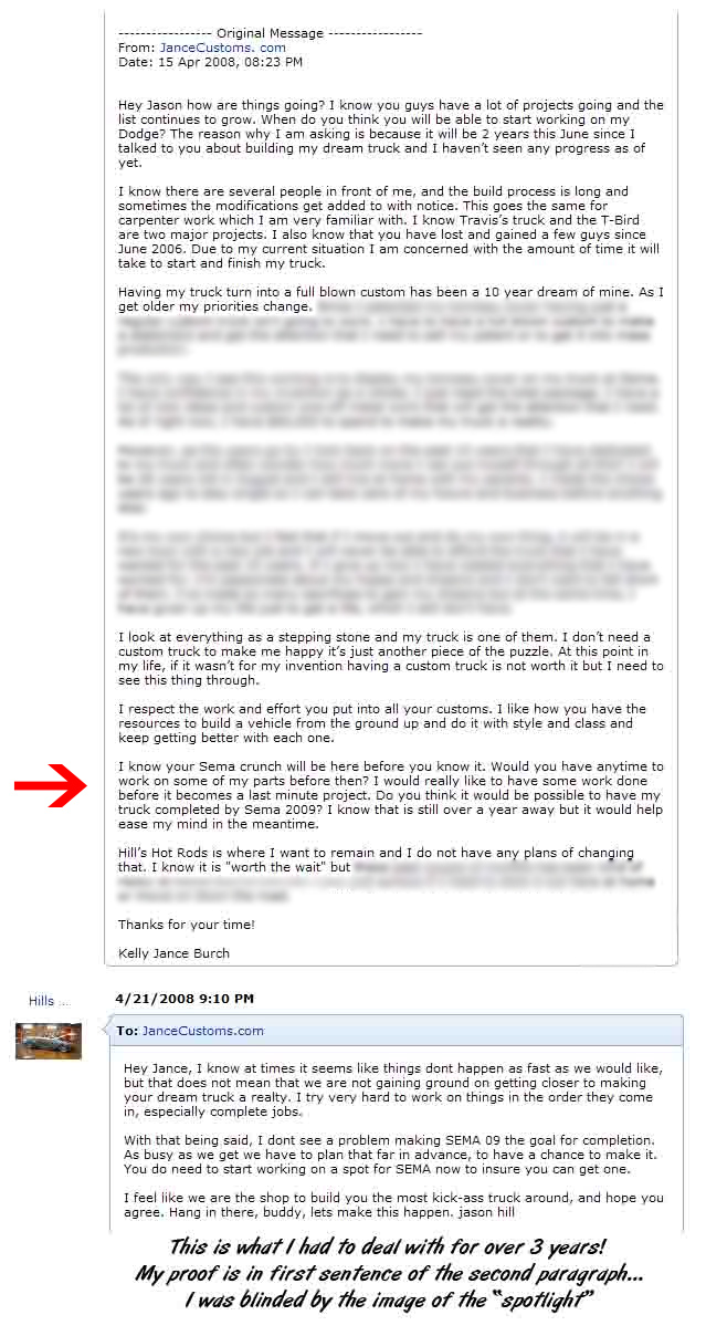 I wanted a “hot rod” shop that specialized in building custom vehicles so I made a call and got on their “list”. Over the years this shop has produced a lot of show vehicles that have been featured in all the custom truck magazines. So I knew they were a reputable shop that could create my dream truck. I made a visit to the “hot rod” shop to see what kind of plans I needed to make and to meet the owner for the first time. I decided that since it was a four hour drive one way from Elk City, Oklahoma I was going to take some parts with me. This way if they ever had time they would be able to work on them. I loaded up my doors and I took a road trip. We went over my plans for the truck and we talked about deadlines. At this time I told the owner what I had been through and what my truck means to me. I told him about my goals and my sacrifices and everything I was willing to give up in order to make my dreams a reality from day one. I told him I wanted to build a Sema Show truck for 2007. He said it shouldn’t be a problem because at this time, it was June 2006. I ran into the owner a few months later at a car show. He told me “We are almost finished with your doors.” However, today he has no recollection that this was ever said... Since this is my demo vehicle and everything is based around it, anything that is said or done I automatically make a mental note of it and remember every little detail. Since my doors were almost finished, for my next trip I loaded up my bed so they could start building a new tonneau cover. However the next time I made a visit, my doors were no where to be found and no one had even been working on them... Since I want to take my truck to the next level, I began with smoothing out all the plastic pieces under the hood and the interior. Once my engine was on a stand, I began removing all the texture and imperfections. I then moved on to smoothing out the intake manifold and the transmission to have them ready for polishing. Everything else such as the suspension, driveshaft, rear end and the frame was ready for body work and chrome. It’s all in the details! I endured a lot of misleading conversations with the owner time and time again. I was always told that something new was delaying progress. At one point he lost his two best employees, and sadly there were a few deaths in his family, so I expected to wait. After missing the deadline of Sema 2007, I still had hopes for 2008 that my truck would finally be in the rotation! However, I felt that no matter how many phone calls or visits I made that nothing was ever going to change. So just like I am doing now, on April 15, 2008 I wrote the owner a personal letter about my situation. Since I knew everything I had on my list would be impossible to make for the upcoming Sema, I asked if it would be possible to have my truck completed for Sema 2009. I wish I would have called him on the phone and waited for him to tell me he "has" or he "is" working on my truck. Then two minutes later walk through the door while I'm still on the phone with him and ask to see the progress... |